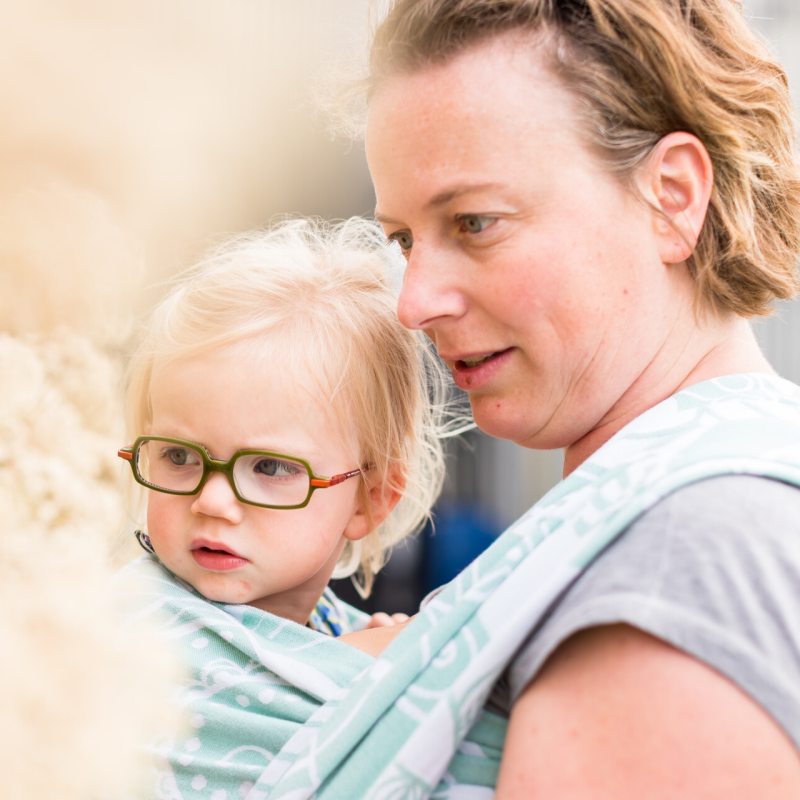 Maar dragen had nog meer voordelen. Ik ondervond met mijn natuurlijk en professioneel ontwikkeld zorginstinct hoe we er beiden van profiteerden. Milla was prikkelgevoelig en kon (en kan) nog steeds helemaal tot rust komen in de draagdoek. Zo veilig en geborgen. Het was een boost voor de borstvoeding en ik genoot van de band tussen ons, de rust momentjes met nog twee aandachteisende kleuters. Dus wilde ik meer doeken proberen en meer over draagsystemen weten en testte tal van draagzakken uit. Vooral de technische kant boeide me enorm, dat kantje heb ik van m'n vader geërfd.